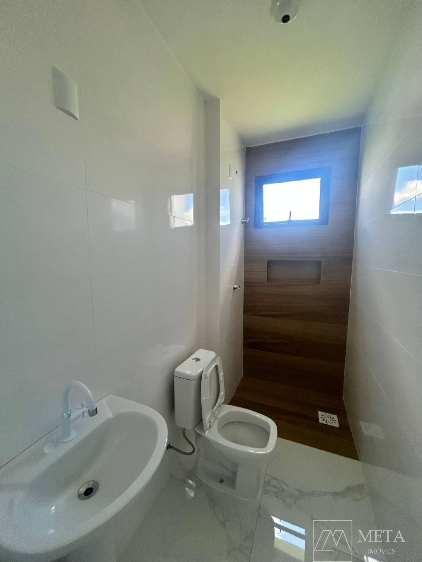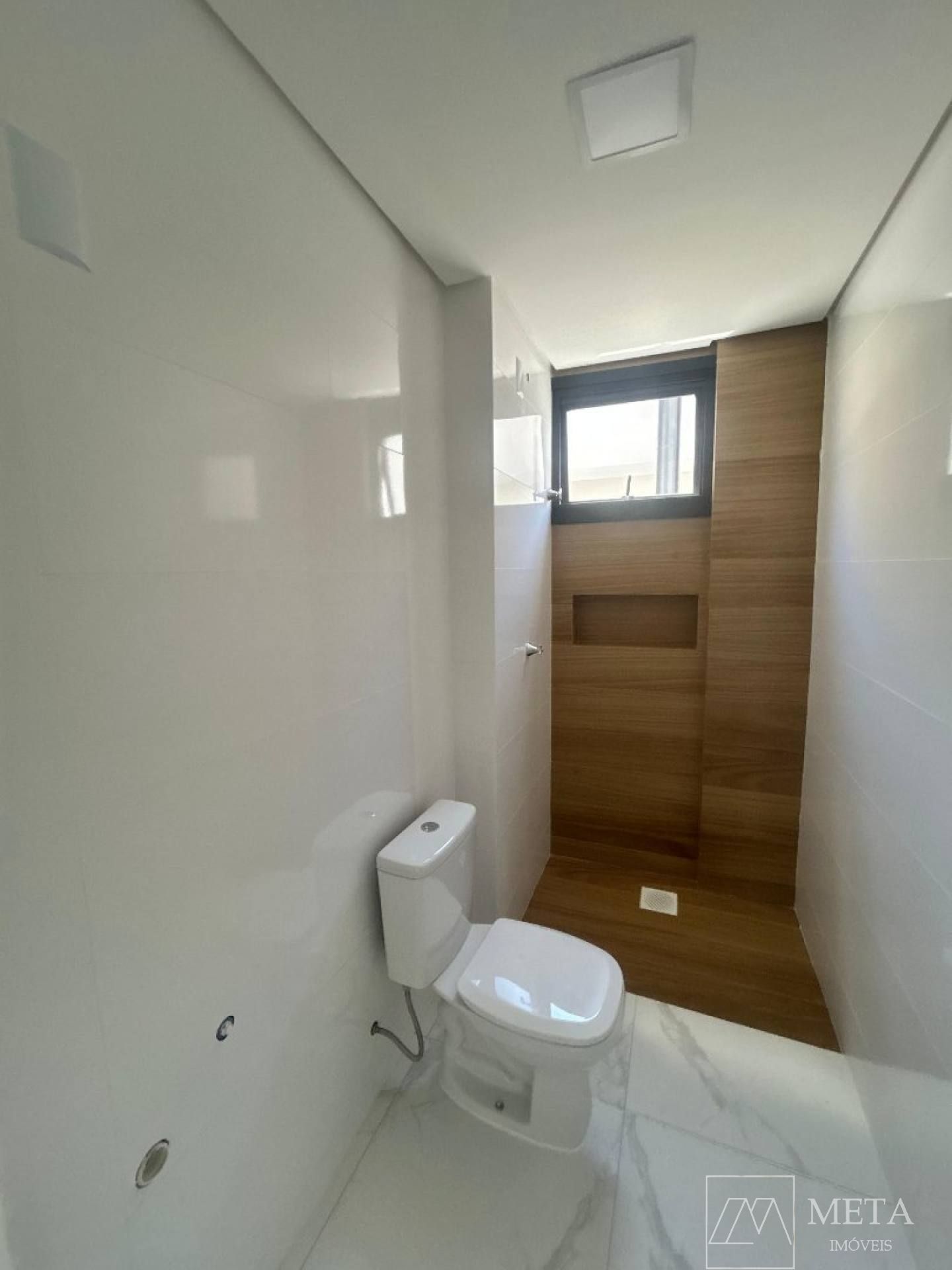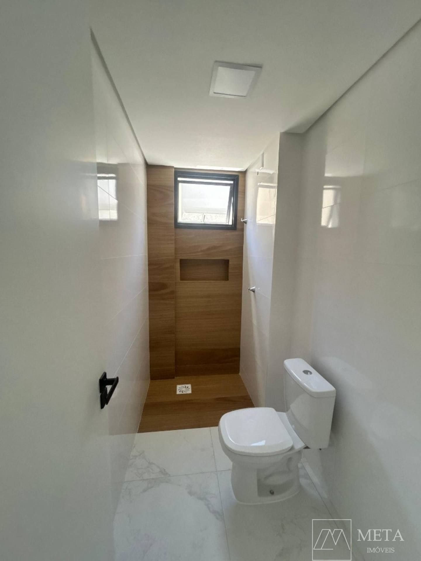 BWC Social: Banheiro social com acabamentos de qualidade, equipado com nichos para armazenamento e revestimento até o teto, garantindo um visual elegante e de fácil manutenção.