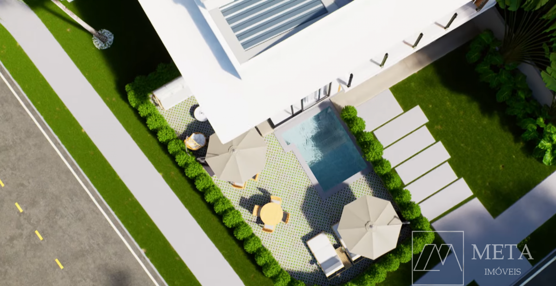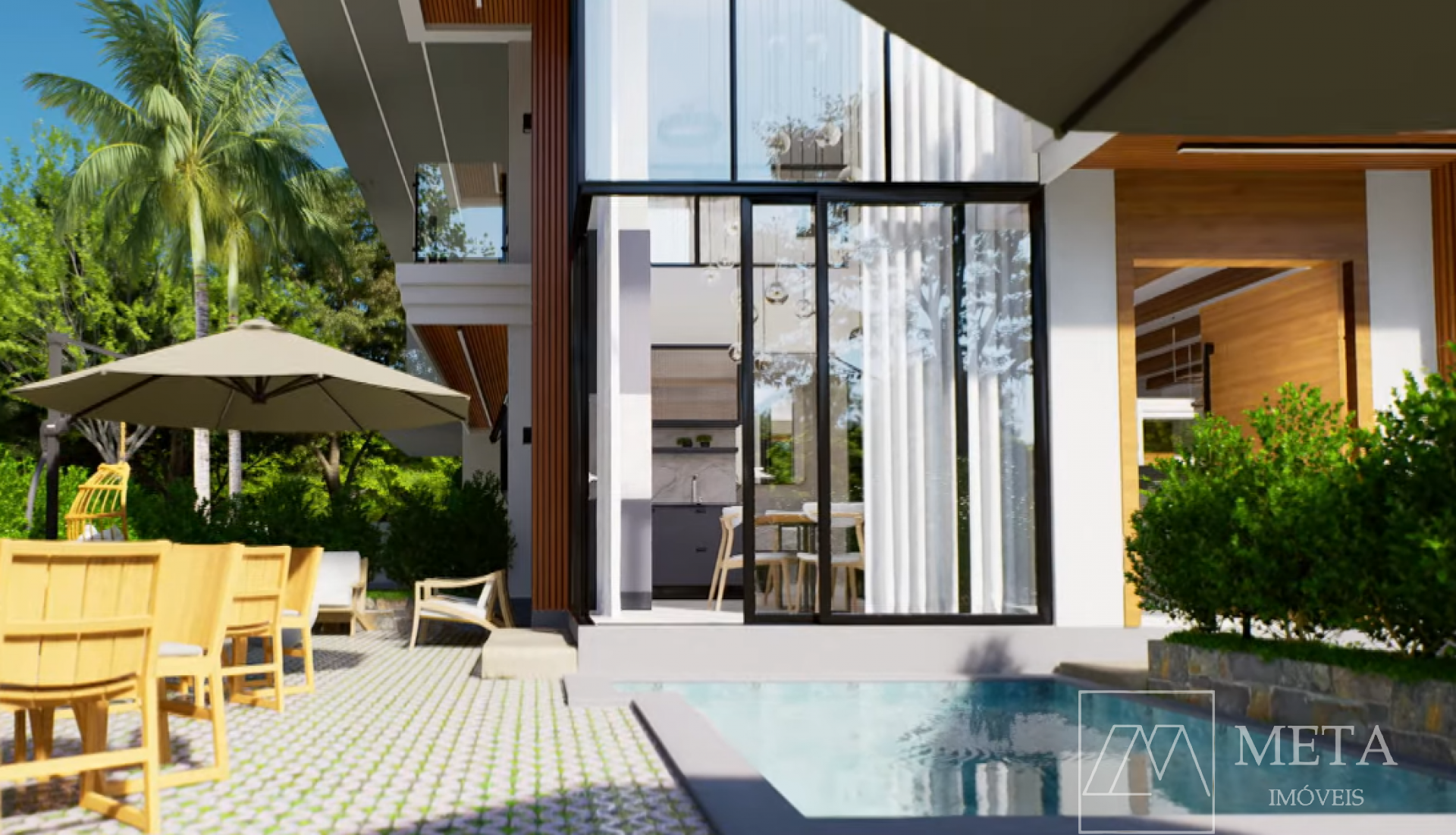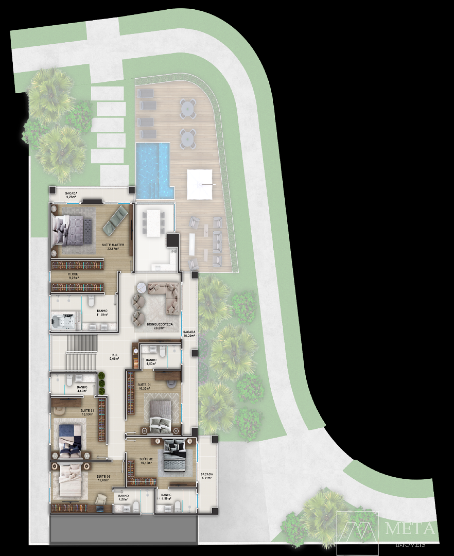 para quatro carros, área de recreação coberta, depósito, piscina na área