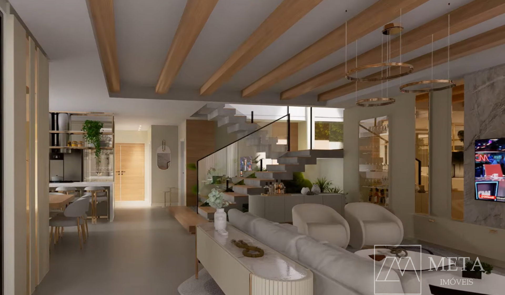 escadas, área de circulação, cinco suítes, sendo uma suíte master, e